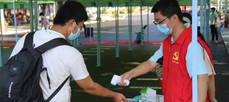 今天一大早,由机关党委志愿者组成的机关党员突击队已经在校门处守候,他们主要负责做好入校学子的粤康码查验、口罩更换等工作。早上7点多,就陆续有学子走进校园。他们从校门通道进入后,经过测量体温、出示学生证、粤康码,戴上志愿者为他们提供的新口罩,再经过后勤工作人员为随身物品行李进行消毒后,便可以回到宿舍区。