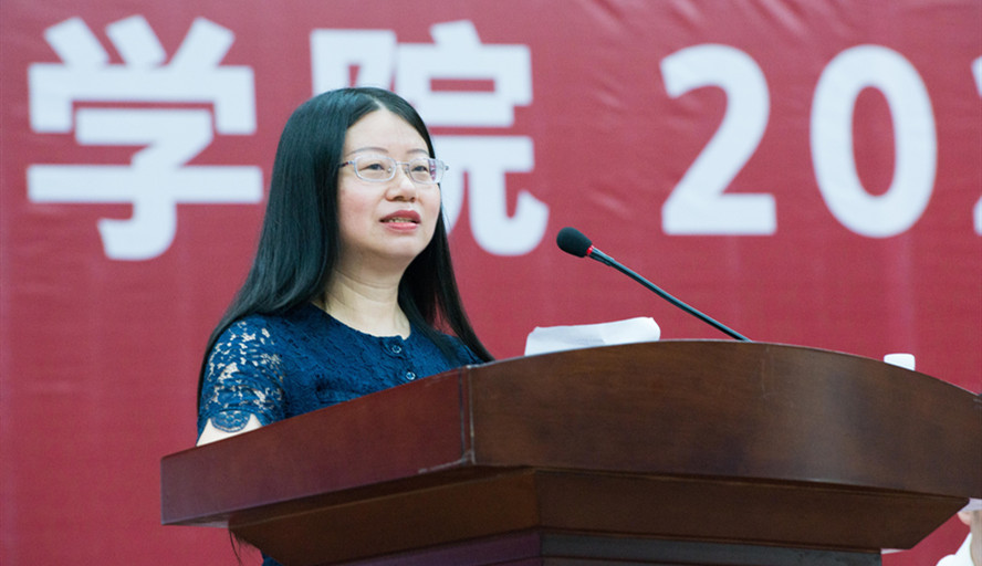 教师代表、肇庆市优秀教师、2020年校教学名师文学院陈爱香教授发言,向新生送上殷切祝福与寄望,勉励同学们自律、自强,升华大学生活、回馈国家培养。