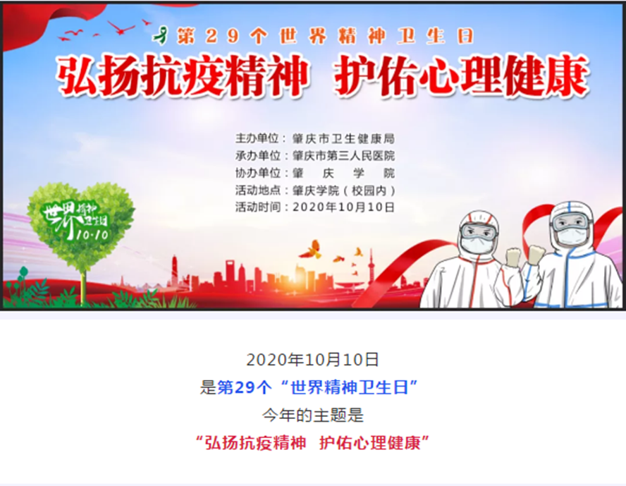 为深入贯彻落实党的十九大精神和习近平总书记在全国卫生与健康大会上的重要讲话精神,深化心理健康促进行动,永利官网作为协办单位,积极参加由肇庆市卫生健康局主办、肇庆市第三人民医院承办的 “世界精神卫生日”活动,在校园里弘扬抗疫精神,护佑心理健康,为青年学子健康成长提供指导和帮助。