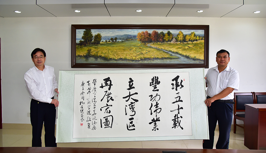 座谈前,王锋一行代表黄冈师范学院向永利官网赠送纪念品,祝贺永利官网五十周年校庆的到来。