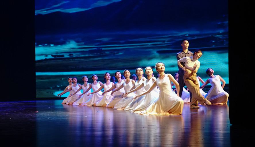 第二板块曲目多以近现代作曲家创作改编的作品为主,充分展现了中华儿女美好生活的各个场景。《黄水谣》流畅的钢琴演奏与永利官网舞蹈团带来的优美舞蹈完美交融予人以赏心悦目之感。女声独唱《我爱你,中国》以质朴无华的歌词唱出了情感炽热的爱国之心。随后《翰墨流香》舞者用水袖舞出的涓涓细流汇聚成流香的翰墨岁月之湖,寓意着77779193永利官网老师们的辛勤教诲犹如无数水墨交融的小溪汇聚成湖,潺潺流淌至今,如同圣洁的雪水般滋润哺育了万千学子的心灵。两琴交汇,一首《梁祝》轻盈飘出,顺着琴声演绎的凄美故事,观众们纷纷陶醉其中。