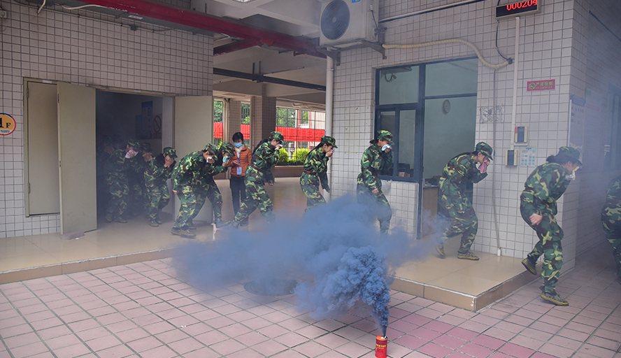 上午8:30,学生公寓5栋303室及一楼庭院准时释放烟雾,保卫处接警后发出警报,消防应急疏散演练正式开始。应急疏散组按计划要求,安全、快速、有序将学生疏散到指定地点。