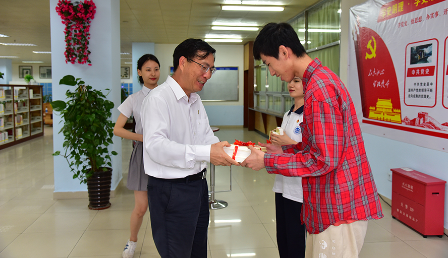 谢冠华向学生代表赠书,希望青年学子能学习习近平同志《论中国共产党历史》一书的丰富内涵,用党史知识武装头脑,坚定理想信念,不断提升个人本领。
