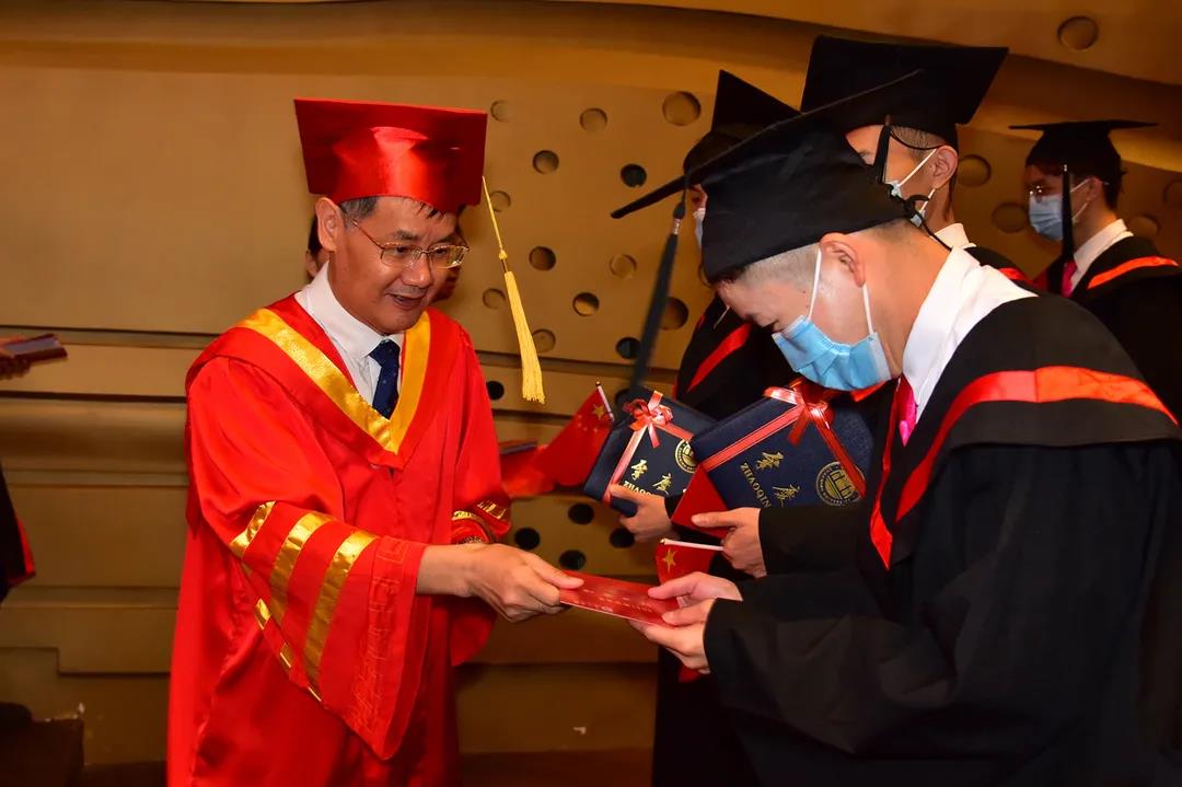 学位授予仪式上,吴业春为获得学士学位和辅修学士学位的毕业生代表拨正学位帽流苏,颁发学士学位证书。
