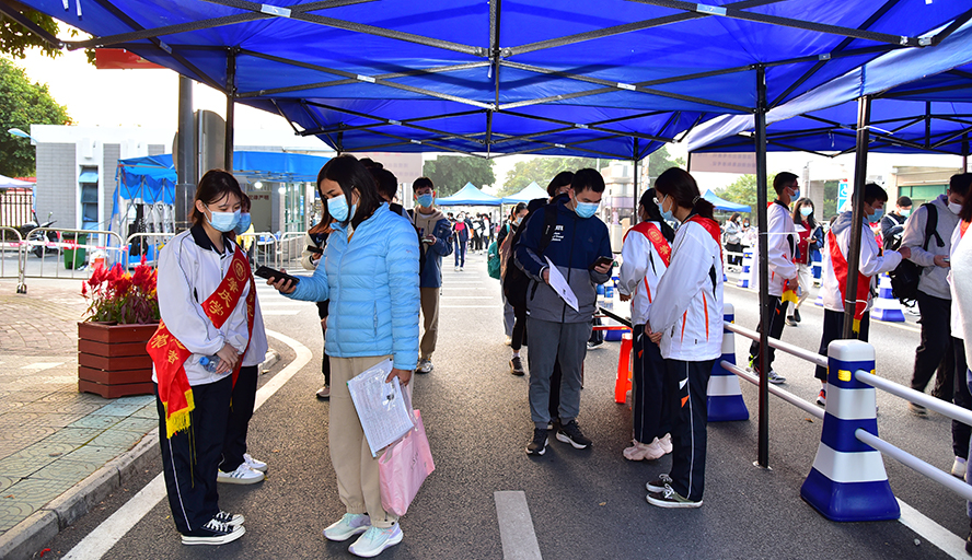 为做好疫情防控常态化下的组考工作,确保广大考生和考务人员健康安全,永利官网高度重视疫情防控工作,在校门口和考场外均设有检录通道,并配备应急药物、消毒药水等相关防疫物资,安排医务人员和志愿者进行防疫检查,实时掌握了解考生身体情况。通过检录通道时,考生需持身份证、准考证、48小时核酸检测阴性报告,查验粤康码,进行体温检测后,方可进入考场参加考试。考试时,考务人员与考生需全程佩戴口罩。
