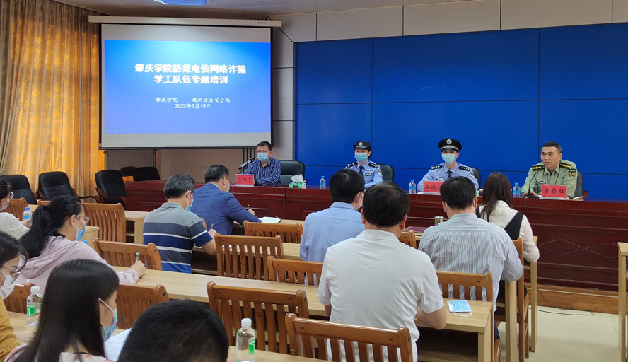 会上,黄镜辉通报了2021年永利官网电信网络诈骗发案情况,并对防范电信网络诈骗工作进行了部署。肇庆市反诈办、端州区反诈办崔晓安警官做了防范电信网络诈骗专题报告,从如何识别电信诈骗,电信网络诈骗的常见类型,如何防范电信诈骗等方面做了专题培训。