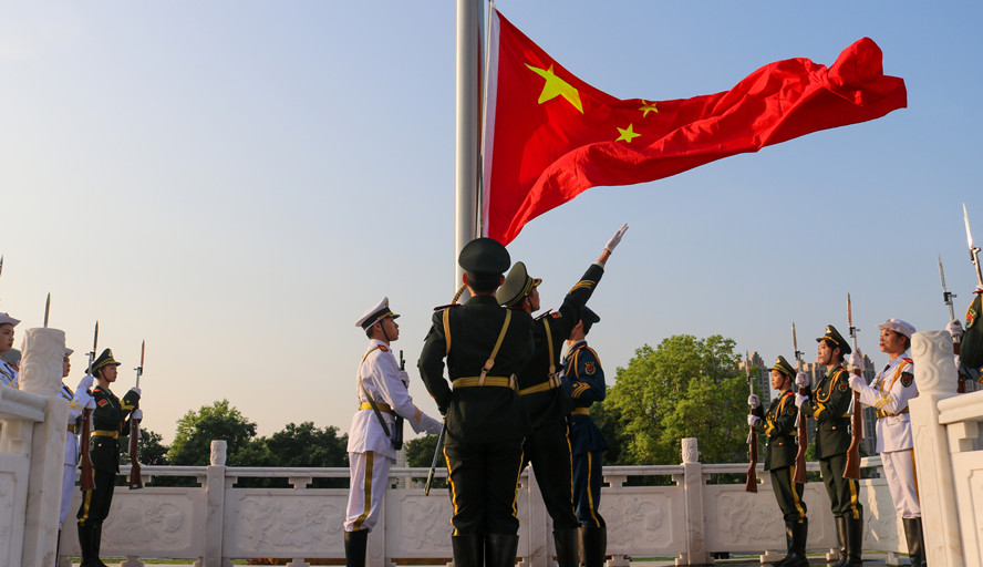 早上7时,在全场师生的注目下,英姿飒爽的国旗护卫队迈着整齐的步伐护送鲜艳的五星红旗进场。伴随着雄壮的国歌,五星红旗在晨光中冉冉升起,在砚园上空迎风飘扬。