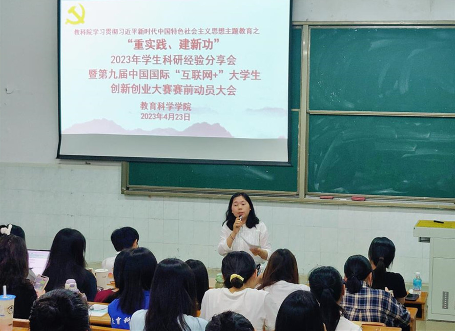 本网讯 近日,教育科学学院在星湖校区举行“重实践、建新功”2023年学生科研经验分享会暨第九届中国国际互联网+大学生创新创业大赛赛前动员大会。国家级大创项目负责人、小学教育专业黄妙等3名优秀同学担任主讲人,2022170多名学生参加分享。