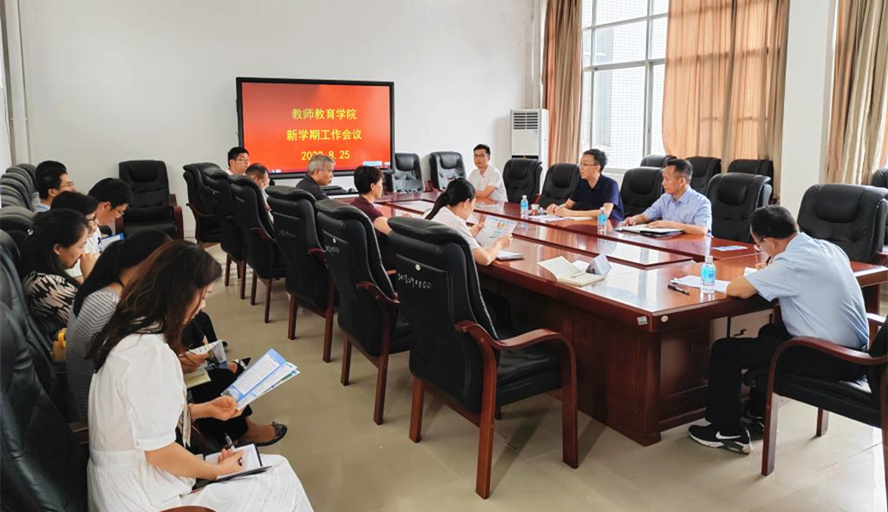 本网讯 8月25日,教师教育学院召开新学期工作会议,安排部署新学期教学工作与本科教育教学审核评估迎评冲刺工作。教师教育学院主持全面工作副院长曾毅主持会议,教学评估与督导中心副主任覃亮受邀出席。