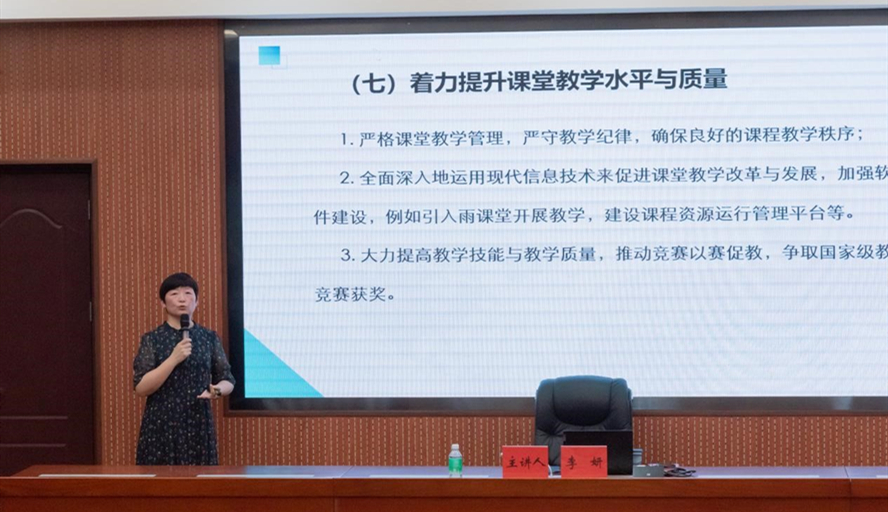在教学专题培训会上,李妍以《77779193永利官网教学管理与教学改革发展情况简介》为题,详细介绍学校教学基本情况、主要教学管理制度和改革与发展方向的内容。她提出,教育的改革和发展需从七个方面不断优化,一是提升专业内涵,加强专业建设;二是以一流课程为抓手,推动课程建设;三是培育优秀教学成果;四是加强教学团队与基层教学组织建设;五是推动教学评价改革;六是实现“学生中心”理念,深化学分制改革;七是着力提升课堂教学水平与质量。她建议新教师要建立自己的学术、工作和社会体系,履行对学生学术、职业和生活的三个导向职责,做好教学的本职工作。