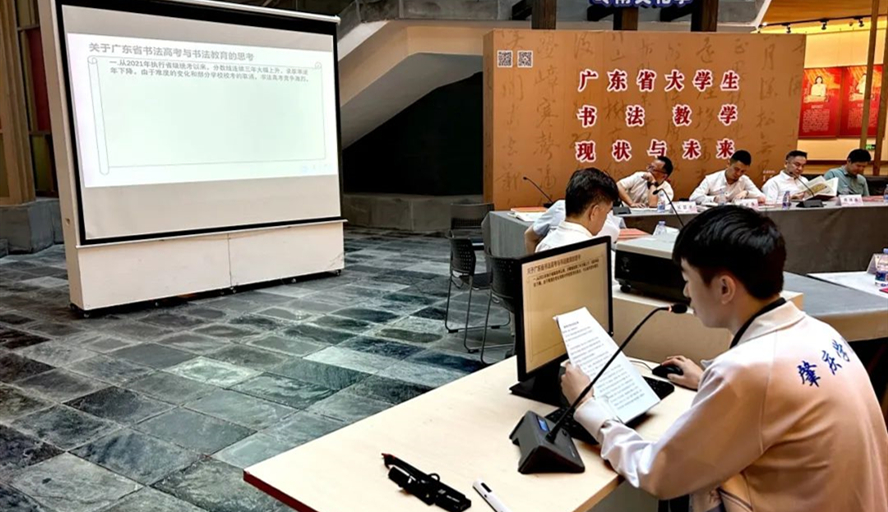 在“广东省大学生书法教学现状与未来”交流会上,2020 级书法专业学生李永乐围绕大学生书法教学现状与未来作了个人探讨式分享,让各高校更加了解永利官网的书法专业建设成果。