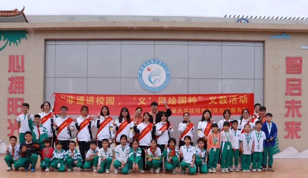 本网讯 为加强砚园学子的思想品德教育,提高同学们的社会实践能力,促进青少年对中华优秀传统文化的热情和积极性。“一站式”学生社区明智书院志愿服务队前往高要区第一小学开展“非遗进校园 ‘义’同绘国粹”志愿服务活动。
