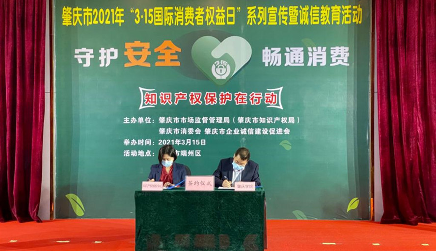 本网讯 3月15日,政法学院、知识产权学院院长祁建平应邀出席由肇庆市市场监管局和市消委会联合举办的“3·15”国际消费者权益保护日系列宣传活动,并代表学院和省知识产权保护中心维权援助肇庆分中心签署知识产权保护志愿服务合作协议。