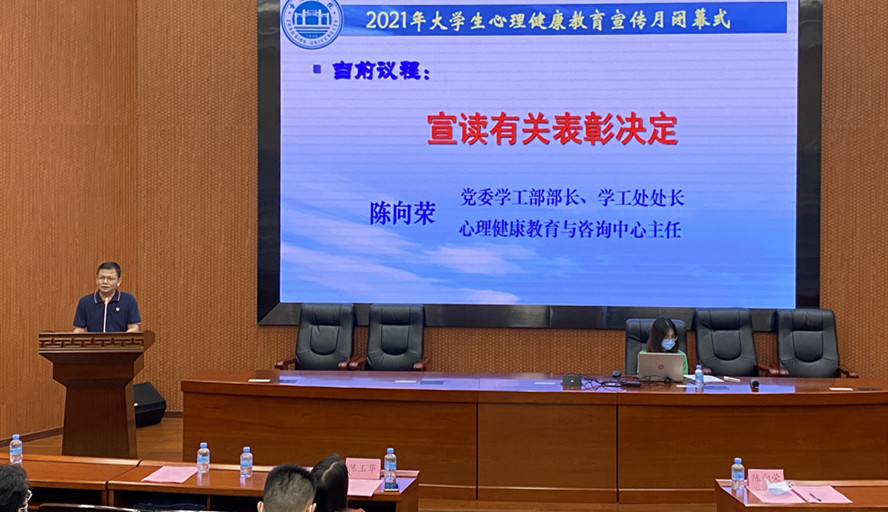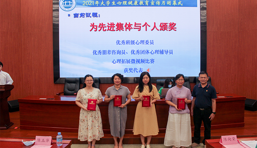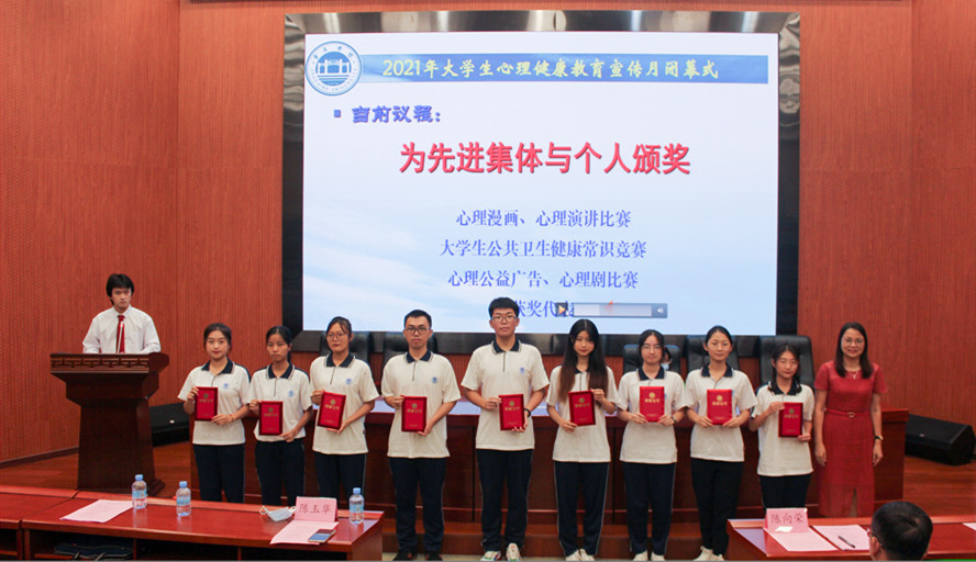 会议宣读了学校心理健康教育宣传月表彰文件及获奖名单,并为优秀班级心理委员奖、优秀朋辈团辅奖、心理拓展微视频奖、心理月优秀组织奖、心理工作先进个人,以及在心理漫画、心理演讲、公共卫生健康常识、心理公益广告、心理剧等比赛中获奖的人员进行了颁奖。