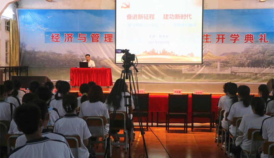 本网讯 二级学院党组织书记、院长上好新学期第一堂思想政治理论课,近年来已经成为新学期开学教育的必修课。9月20日,经济与管理学院党委书记黎天宇、院长刘玉勋在星湖校区分别给2021级工商管理1至4班和2021级电子商务1、2班的新同学讲授题为《奋进新征程 建功新时代》的党课。