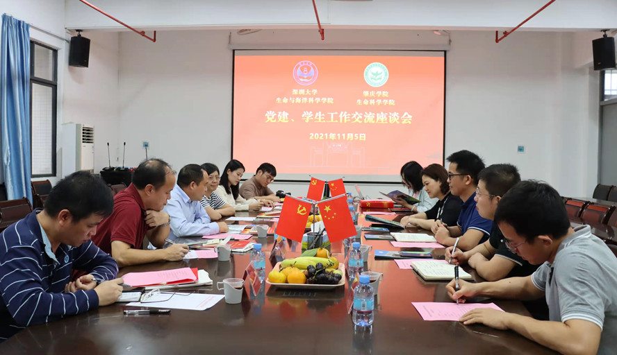 本网讯 11月5日,生命科学学院党委书记胡隼带领学工团队与到访的深圳大学生命与海洋科学学院党委书记梁杰一行就党建与学生工作进行了座谈交流。