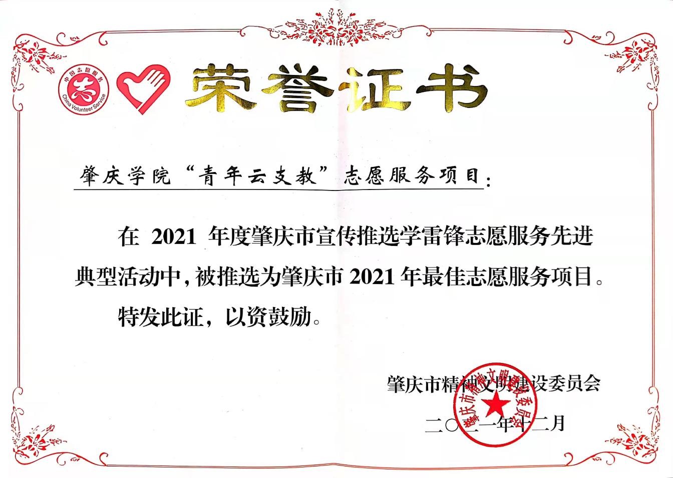 本网讯 为大力弘扬志愿精神,进一步健全志愿服务体系,推进志愿服务制度化常态化,肇庆市近日组织开展2021年度肇庆市学雷锋志愿服务先进典型评选活动。经评选,永利官网“青年云支教”志愿服务项目成功被推选为2021年肇庆市最佳志愿服务项目。