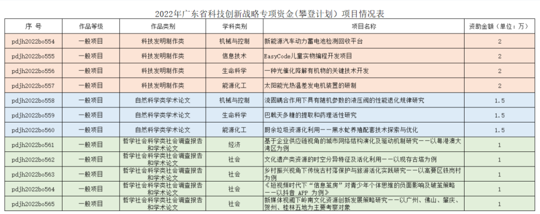 广东省科技创新战略专项资金(“攀登计划”专项资金)是广东省政府每年从财政经费预算中划拨专门用于推进广东省大学生科技创新培育项目的专项资金。每年拨付财政资金3000万元,并且2022年拟拨付财政资金2550万元。在全省遴选、培育和资助大学生科技创新团队开展具有前沿性、开创性的科技创新实践研究。