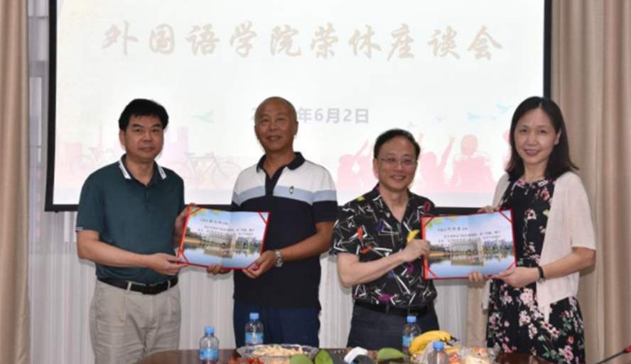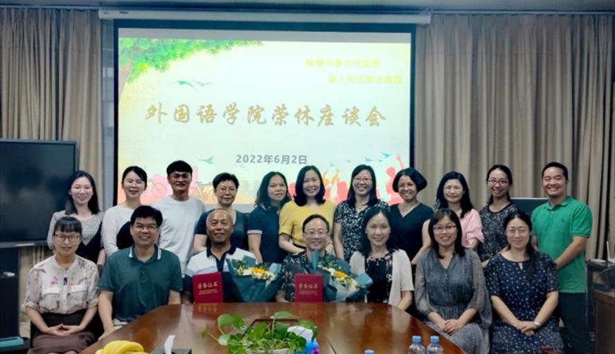 本网讯 6月2日,外国语学院举行荣休座谈会,向彭永和、何舒曼两名退休教师送上感谢和祝福。学院领导班子出席。