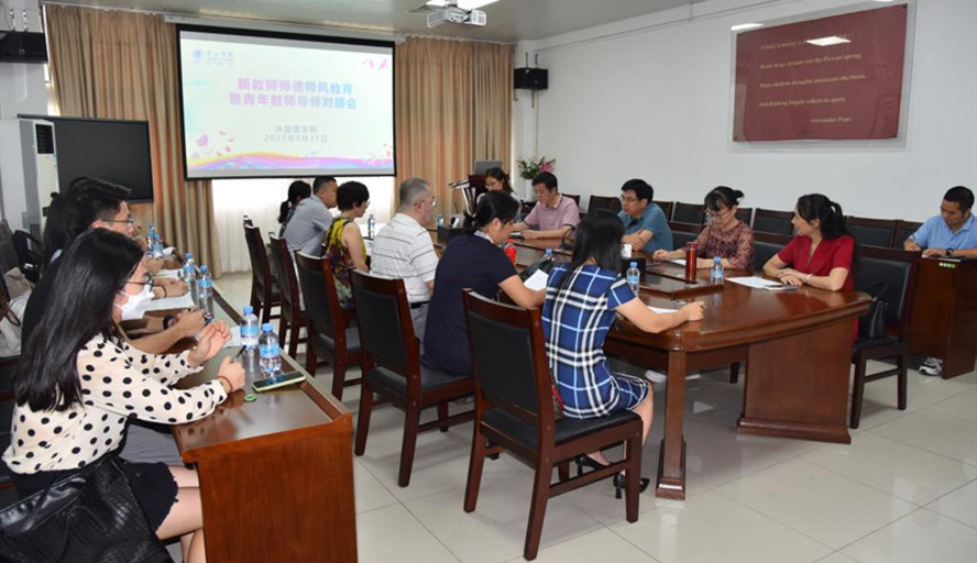 本网讯 为适应新时代高等教育和学校事业发展的需要,加强师德师风建设,提升新入职教师思想政治素质和职业道德水平,促使青年教师健康成长,外国语学院近日召开新教师师德师风教育暨青年教师导师对接会。学院全体班子成员、青年教师导师及新入职青年教师参加了会议,会议由党委书记吕伟荣主持。