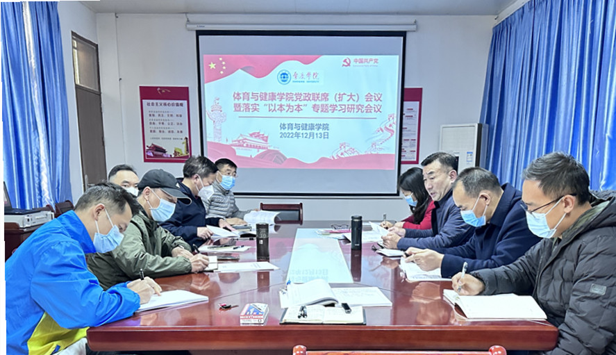 本网讯 12月13日,体育与健康学院院长杨海平主持召开党政联席(扩大)会议暨落实“以本为本”专题学习研究会议,并代表学院作落实“以本为本”工作情况汇报。学院领导班子成员梁艳红、杨丽华、刘汉坤、唐运刚以及各系部主任参加。