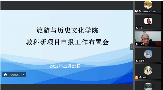 李朝军就2023年教科研申报工作再次动员。他总结了学院2022年度课题申报工作定,并对落实落细《旅游与历史文化学院2023年高层次科研项目申报工作实施方案》提出了具体工作要求。一是要充分认识项目申报的重要意义。教师们要站在学校事业发展的角度,围绕建设“迎评”“申硕”和重点学科建设等发展目标,积极开展各种级别的项目申报工作。二是要严格落实项目申报任务下达和认领制度。各学科要按照要求提高申报项目数量,夯实成功立项的数量基础。三是要科学谋划项目申报工作。学科负责人要利用好学科经费,邀请专家辅导和指导,精心打磨、提高质量,以切实举措提升我院高层次项目的中标率。