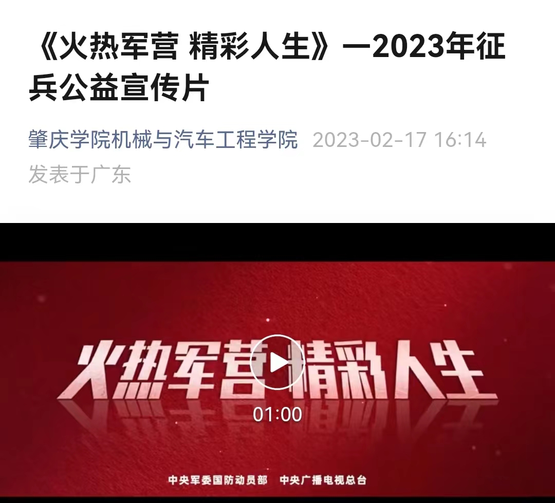 本网讯 日前,由机械与汽车工程学院公众号转发的征兵公益宣传片在机汽学子中引起热烈反响,学院以此为契机,提升力度,加强宣传,进一步营造大学生应征入伍,为保家卫国作出积极贡献的浓厚氛围。